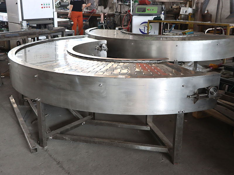 1、鏈板輸送機的輸送面平坦光滑、摩擦力小,物料在輸送線之間的過渡平穩,可輸送各類玻璃瓶、PET瓶、易拉...